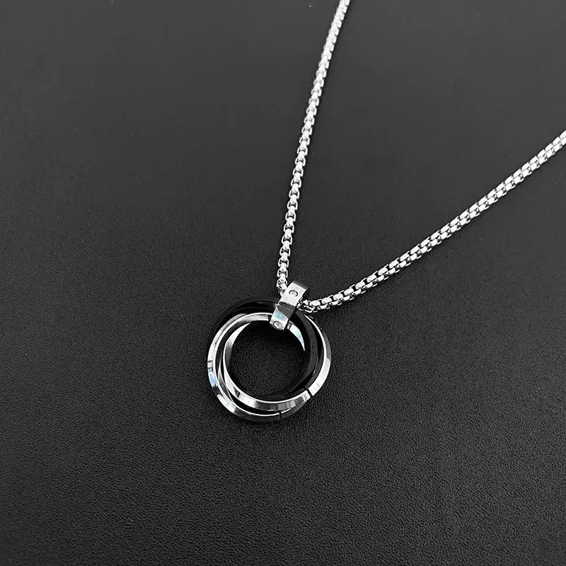 মডার্ন ও এলিগেন্ট ডিজাইনের এই থ্রি-রিং পেন্ডেন্ট আপনার স্টাইলে যোগ করবে প্রিমিয়াম টাচ। সিলভার ও ব্ল্যাক কম্বিনেশনের ইউনিক সার্কুলার ডিজাইন এবং উপরের অংশে স্টোন ডিটেইল এটিকে করেছে আরও আকর্ষণীয়।
