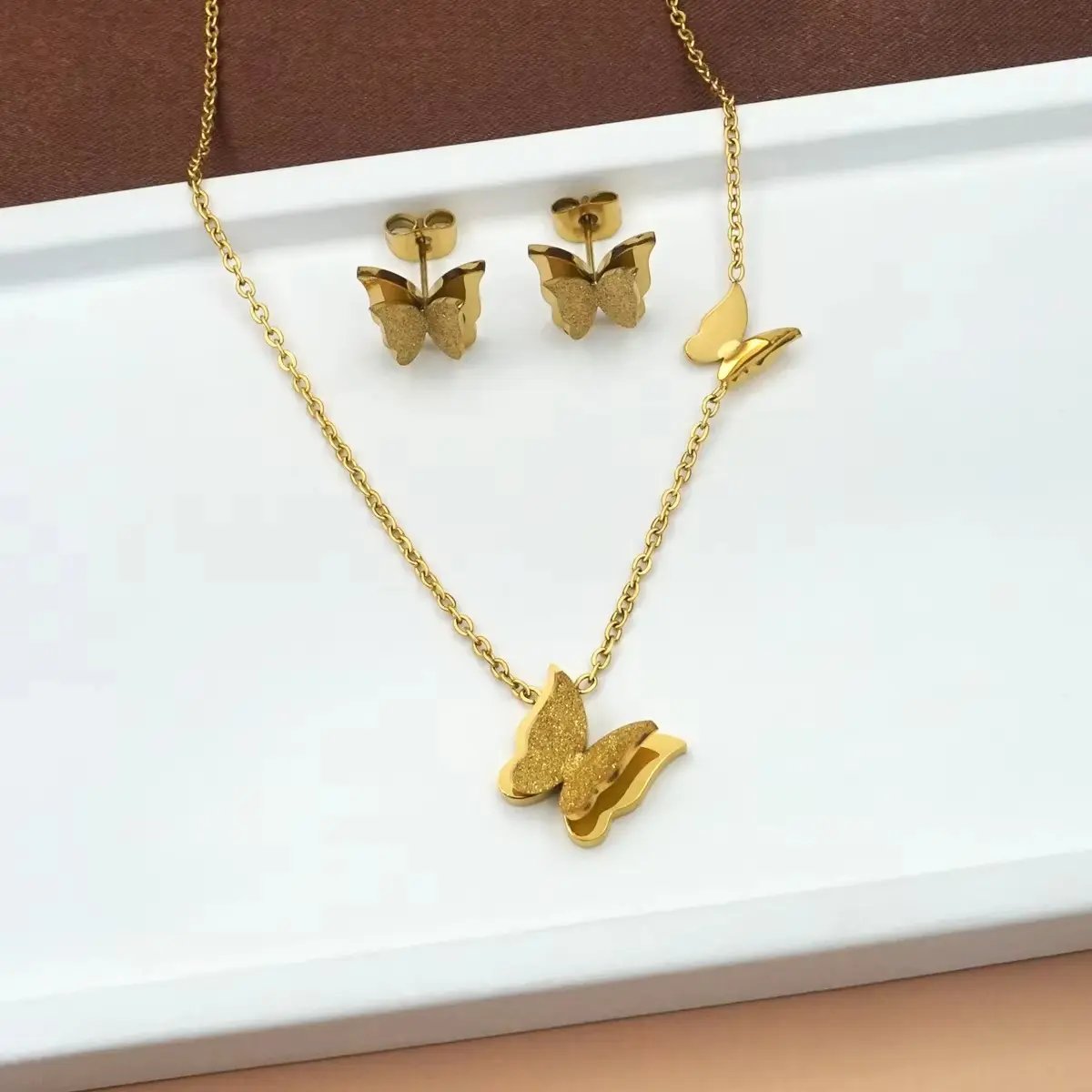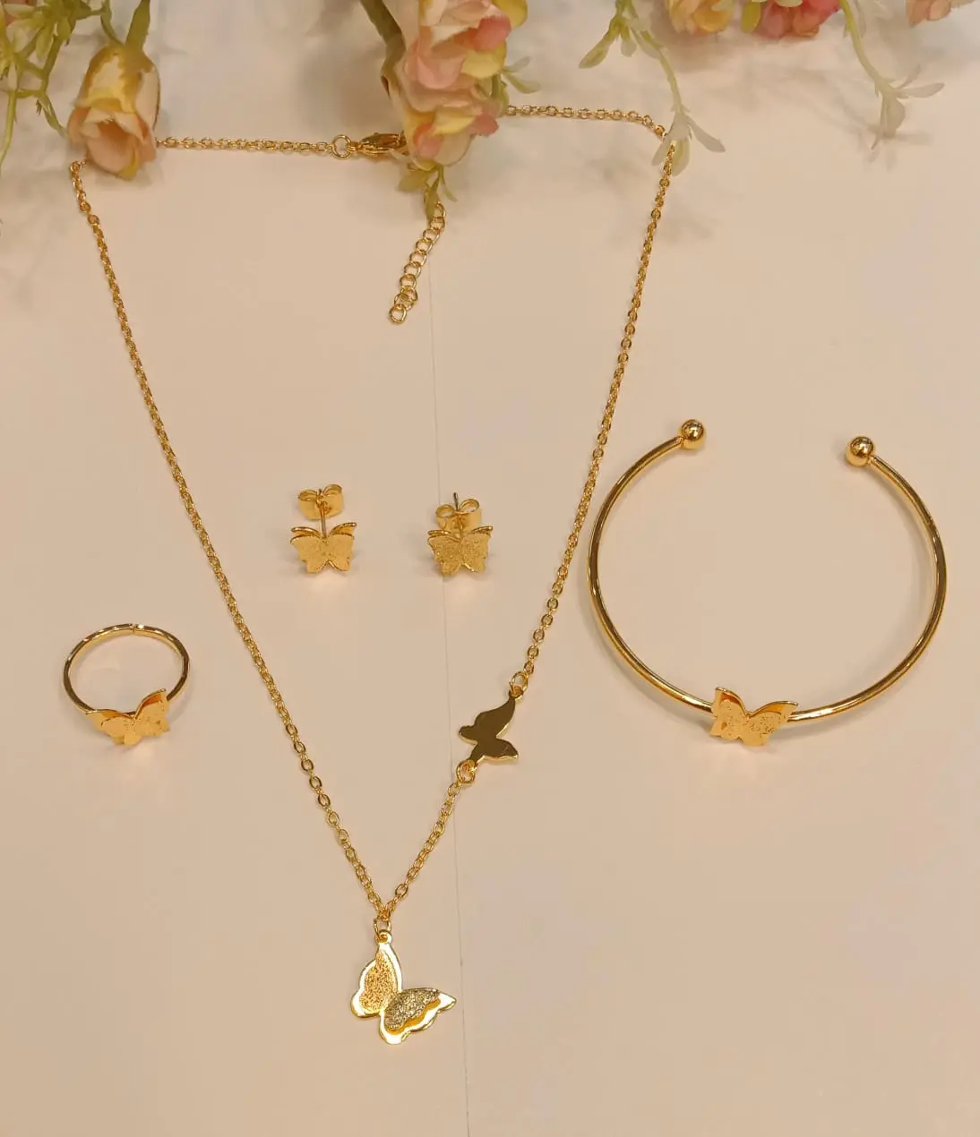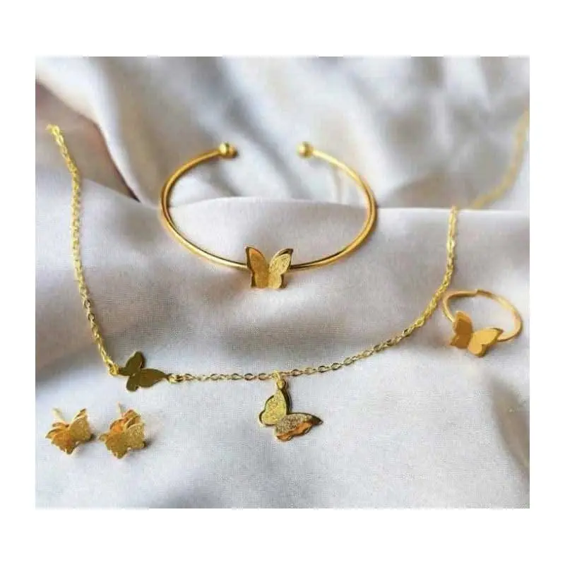 আধুনিক স্টাইল আর লাক্সারি ফিনিশিংয়ের নিখুঁত মিশ্রণে তৈরি এই Golden Butterfly Jewelry Set—যেখানে আছে নেকলেস, ব্রেসলেট, ইয়াররিং এবং ফিঙ্গার রিং।