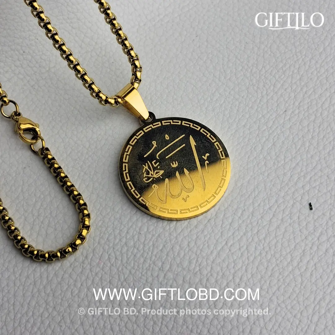 প্রিমিয়াম Stainless Steel দিয়ে তৈরি এই Gold লকেটের উপর অংশে খোদাই করা আছে “Allahu ” এবং মধ্য অংশে খোদাই করা আছে পবিত্র Ayat Al-Kursi, যা দৈনন্দিন ব্যবহার ও নামাজে আধ্যাত্মিক প্রশান্তি দেবে।