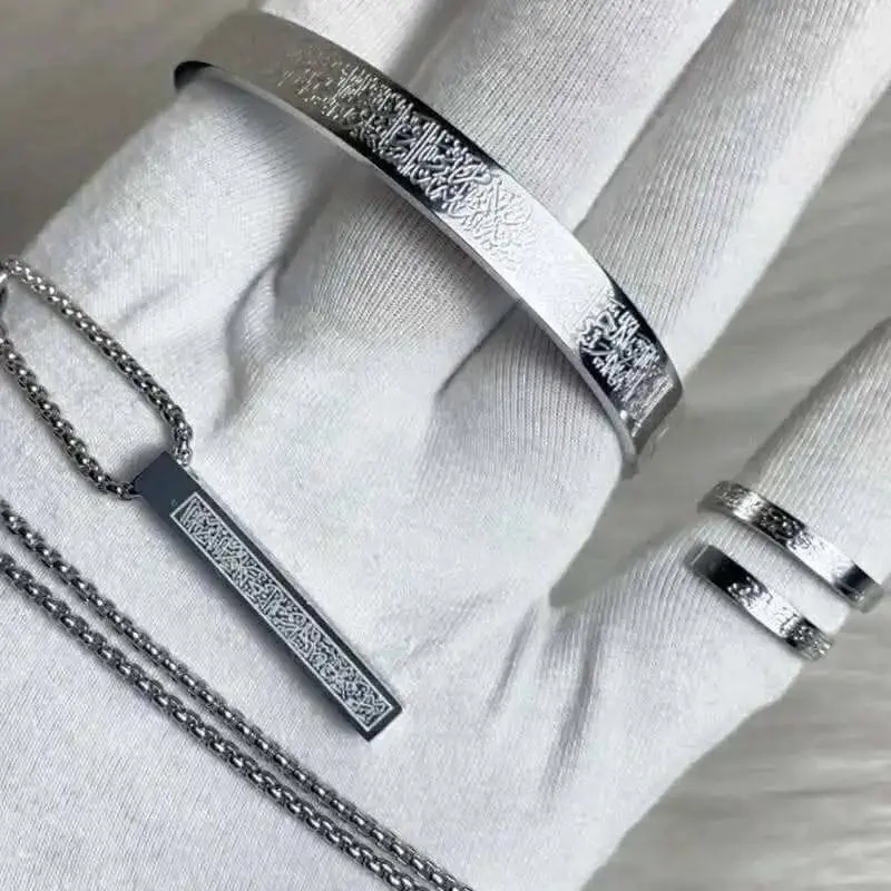 প্রিমিয়াম Stainless Steel দিয়ে তৈরি প্রতিটি আইটেমে খোদাই করা আছে পবিত্র Ayat Al-Kursi (The Throne Verse), যা দীর্ঘদিন রঙ ও সৌন্দর্য বজায় রাখে এবং দেয় এক পরিপূর্ণ ইসলামিক ও এলিগেন্ট লুক।